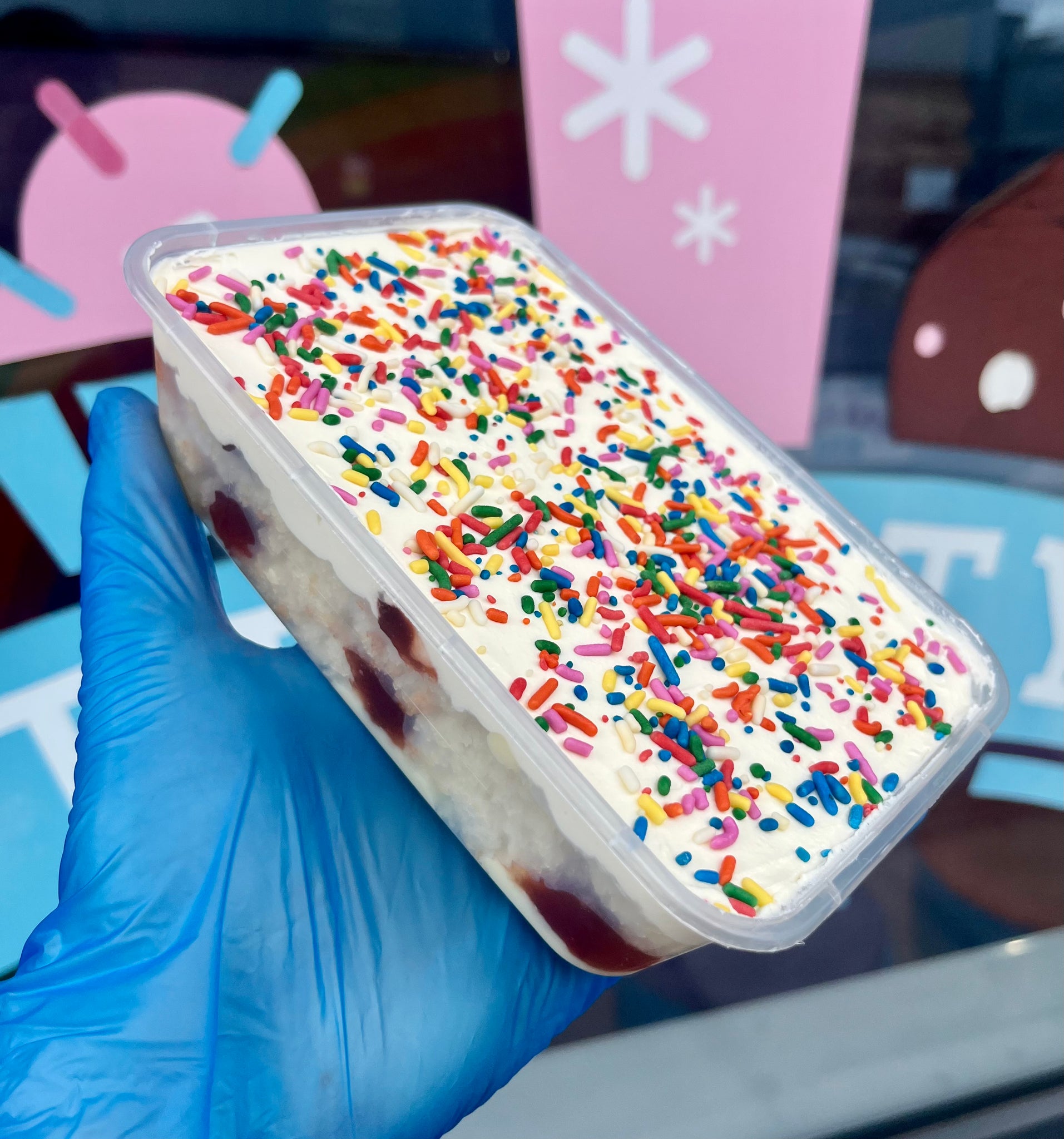 Vanilla Sponge, Strawberry Jam, Milky Bar Ganache, Vanilla Buttercream and Expensive Sprinkles.